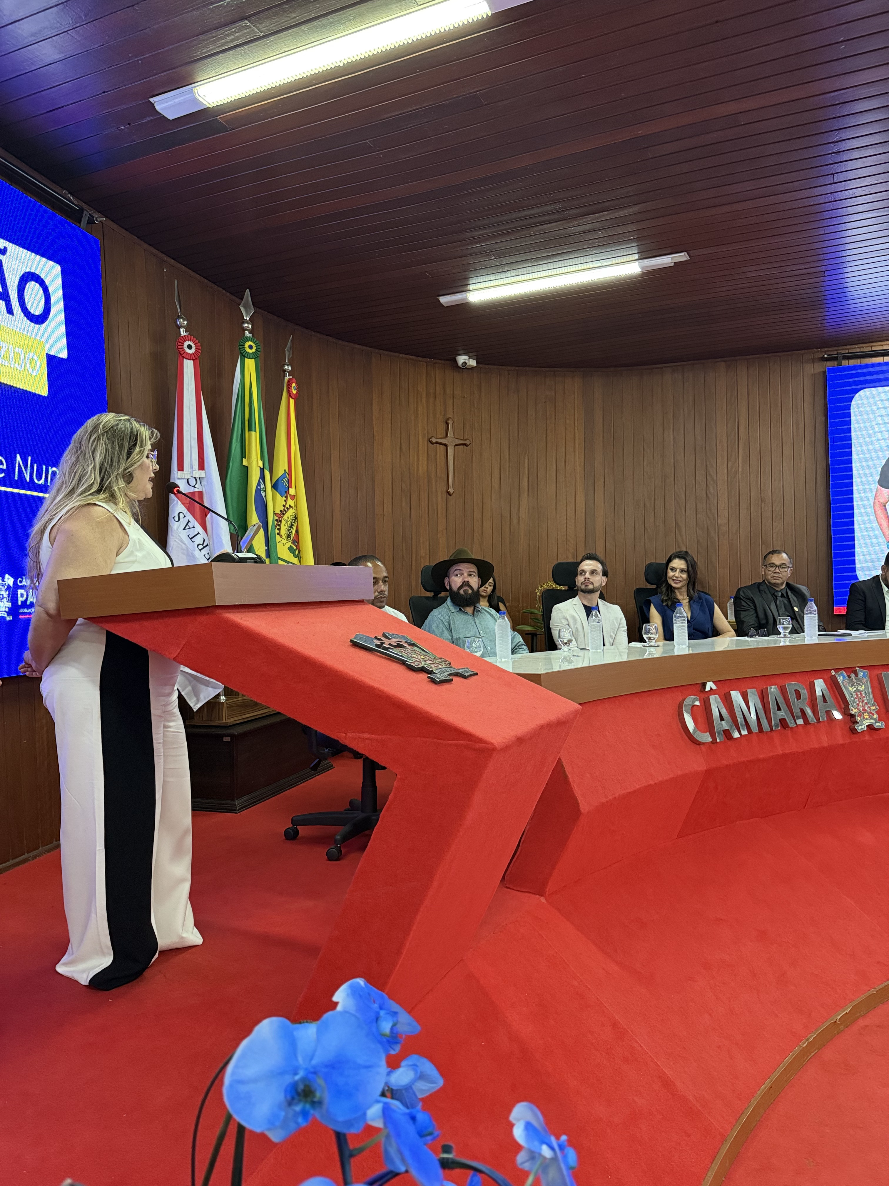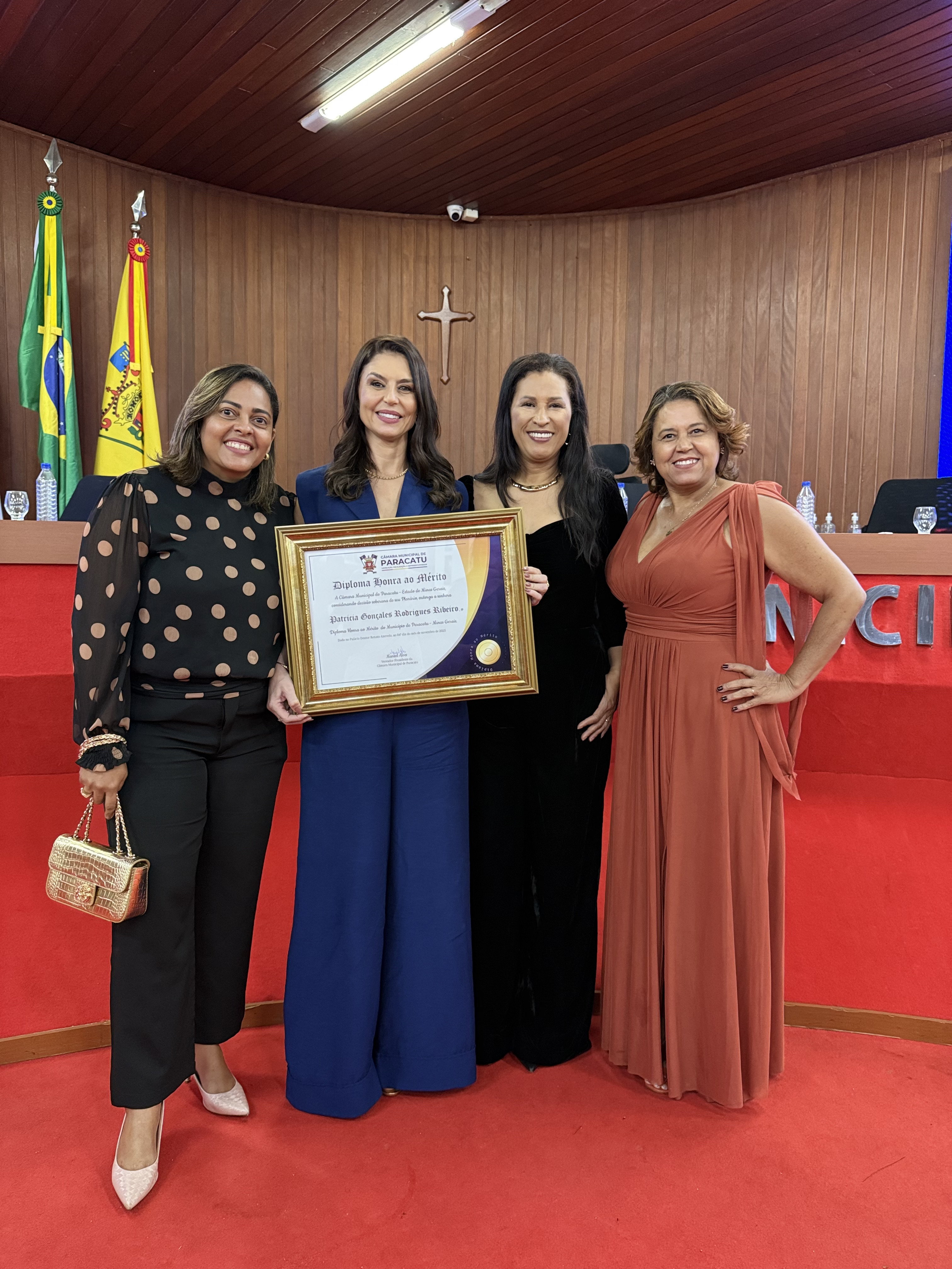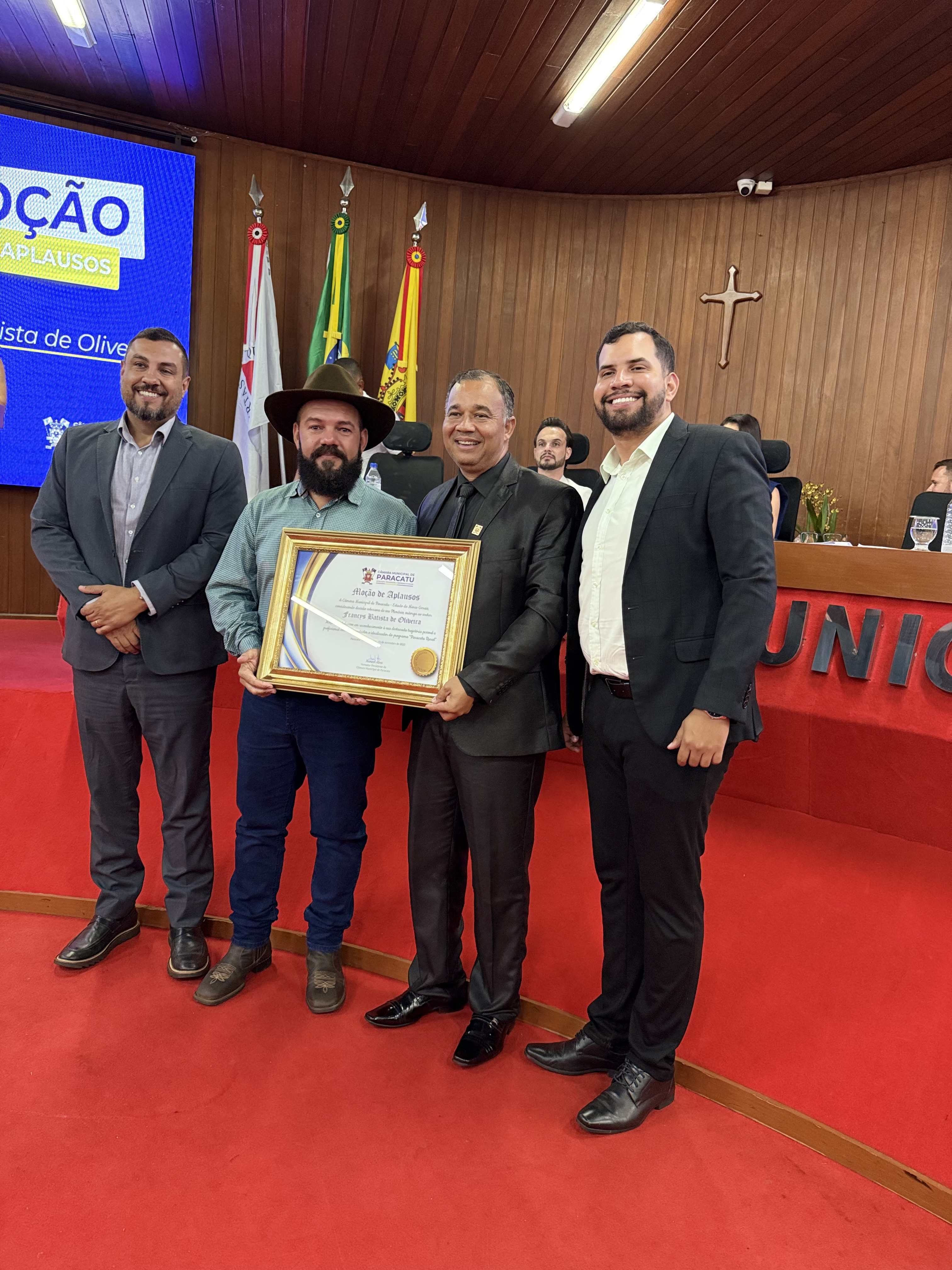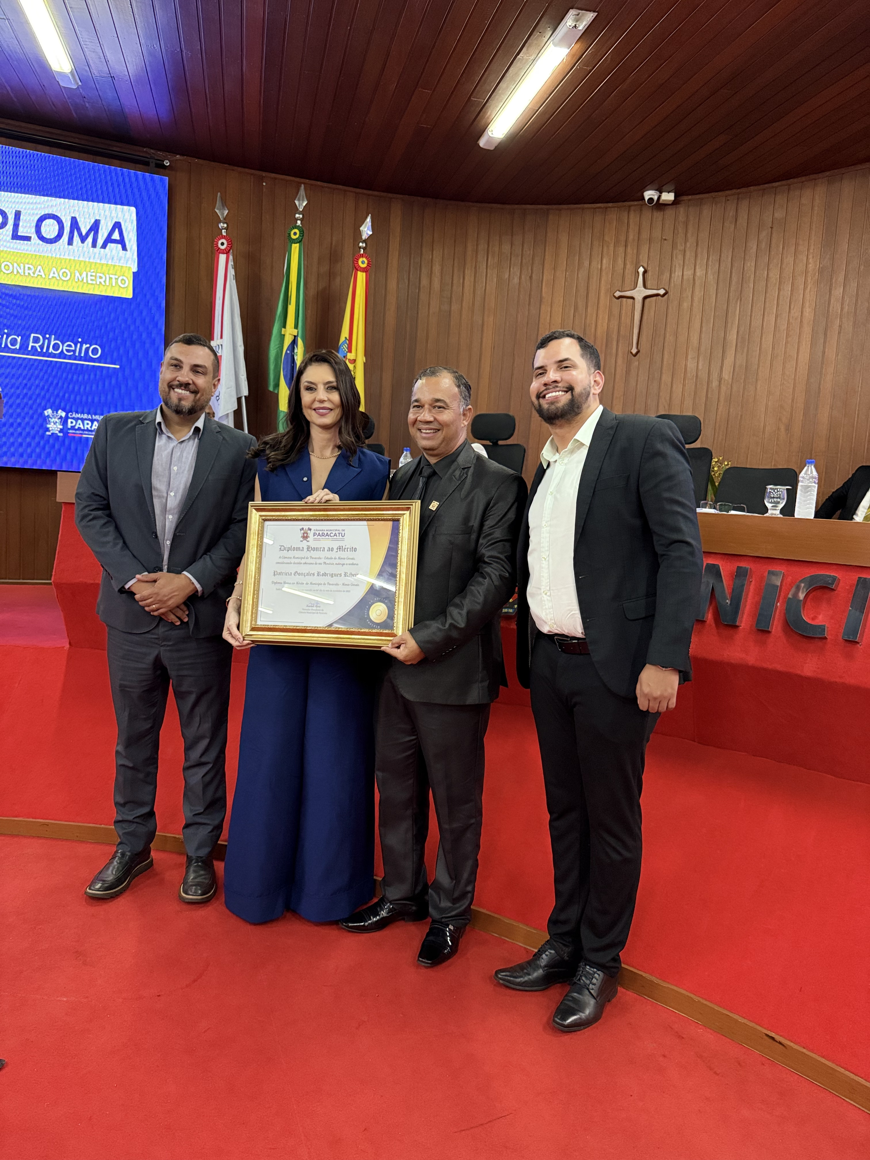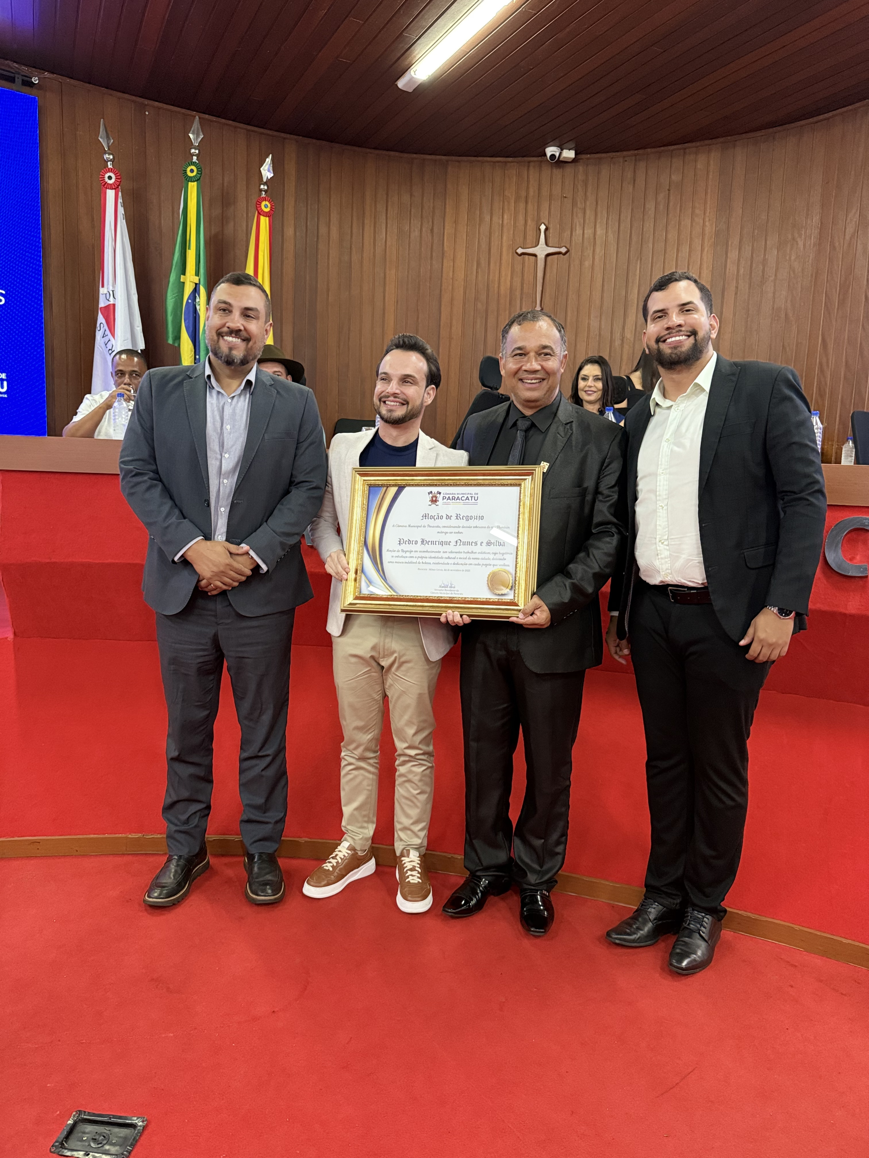 A Câmara Municipal de Paracatu realizou, na noite do dia 4 de novembro, uma Sessão Solene especial dedicada à entrega de títulos e moções de reconhecimento a personalidades e instituições que se destacaram por suas contribuições à sociedade paracatuense. A solenidade foi realizada por iniciativa do Vereador e Presidente Manoel Alves, reunindo homenageados, familiares, autoridades e membros da comunidade no plenário da Casa Legislativa. Durante o evento, foram concedidas as seguintes honrarias: Mérito Desportivo ao Esporte Clube AMABAP, em reconhecimento à sua trajetória, conquistas e ao título de Campeões da Copa Amapá, além dos relevantes serviços prestados ao esporte e à comunidade. Moção de Aplausos ao Sr. Francys Batista de Oliveira, em celebração aos 10 anos do Paracatu Rural e pelos importantes serviços prestados ao fortalecimento do agronegócio e ao desenvolvimento local. Diploma de Honra ao Mérito à Sra. Patrícia Gonçales Rodrigues Ribeiro, como forma de reconhecimento à sua trajetória e dedicação em prol da comunidade paracatuense. Moção de Regozijo ao Sr. Pedro Henrique Nunes e Silva, em homenagem à sua atuação destacada e às relevantes contribuições sociais e comunitárias. O presidente Manoel Alves destacou, em sua fala, a importância de reconhecer o trabalho e o esforço de pessoas e instituições que ajudam a construir uma Paracatu melhor. “Essas homenagens são um gesto de gratidão do Poder Legislativo a todos que fazem a diferença em nossa cidade, seja no esporte, na comunicação, na solidariedade ou na promoção do bem comum”, afirmou. A cerimônia foi transmitida ao vivo, permitindo que toda a população acompanhasse esse momento de reconhecimento e celebração.